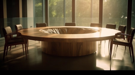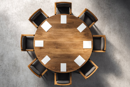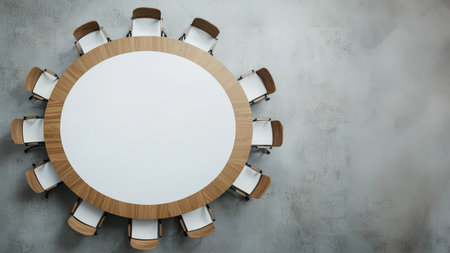A top down view of circular boardroom table surrounded by leather chairs, creating professional and inviting atmosphere for meetings..