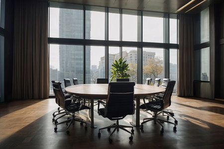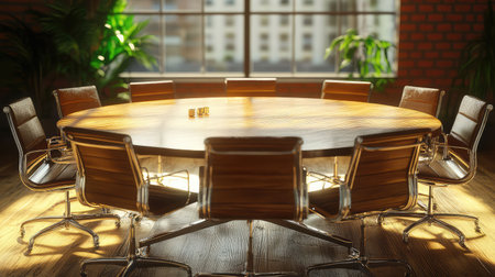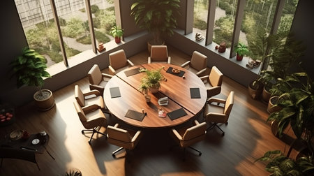 A top down view of circular boardroom table with leather chairs, surrounded by plants, creating professional and inviting atmosphere for meetings..