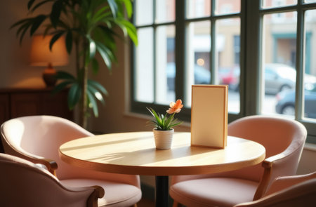 wooden table in a cafe with soft chairs near the window, on the table there is a blank white advertising poster, next to it there is a flower in a pot, outside the window there is a sunny day, coffee shop advertising concept