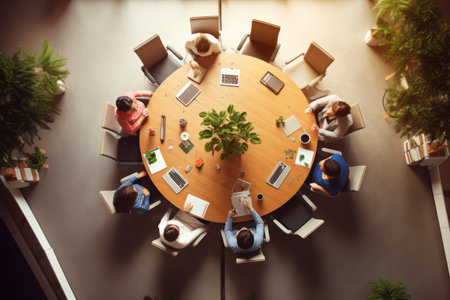Overhead view of business professionals seated around a circular table, symbolizing collaboration, unity, and strategic planning.