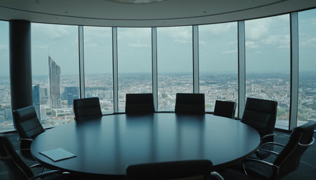 A top down view of circular boardroom table surrounded by black leather chairs, showcasing modern and professional atmosphere..