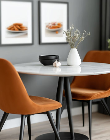 A stylish round dining table with orange chairs features a vase of dried flowers. A small bowl and garlic add subtle details, surrounded by minimalist wall art in a bright, contemporary space.
