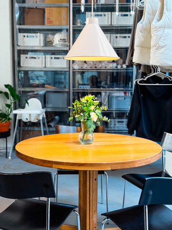Round wooden table with vase of flowers inside cafe. Interior design, lifestyle, and social gathering.
