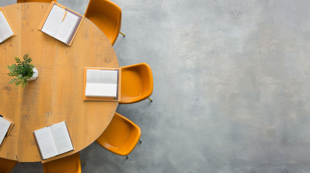 A modern workspace featuring a round wooden table, orange chairs, and open books, ideal for collaboration and creativity.
