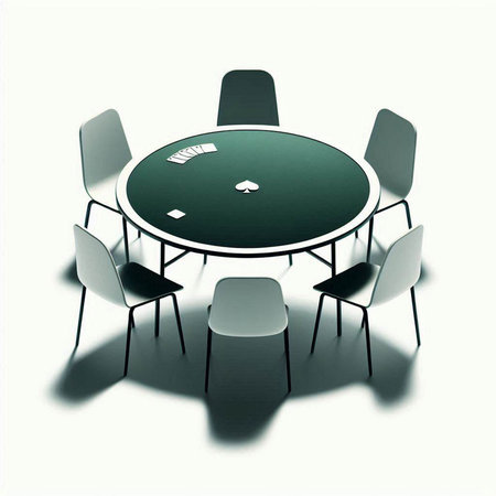 A circular white table is surrounded by four chairs in a modern setting. Two chairs are a vibrant blue, and two are white. The design features smooth lines and subtle shadows. The arrangement suggests a space for collaboration. This setup is suitable for a variety of business or design-related illustrations.
