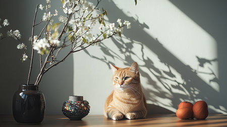 A serene indoor setting featuring a ginger cat resting beside a flowering branch and decorative pottery. The interplay of light and shadows creates a calm atmosphere, ideal for cozy home decor.