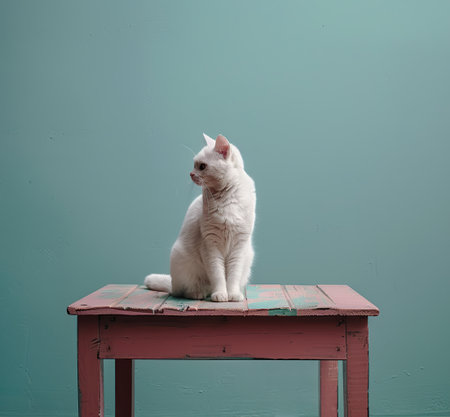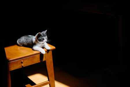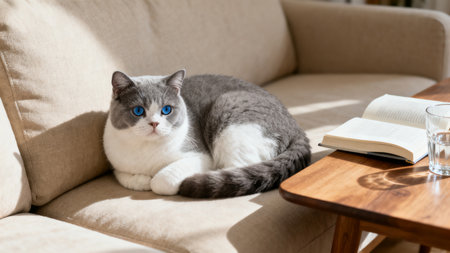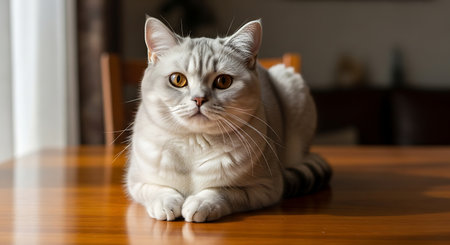 A domestic cat with grey and white fur is centered, bathed in natural light. The close-up showcases vibrant yellow eyes. A minimalist setting with subtle shadows and a small decorative object suggests an interior space. Suitable for various editorial and commercial applications.