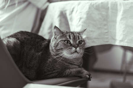 tabby scottish straight cat with funny looking. Cat Portrait. Cute cat indoor shooting.