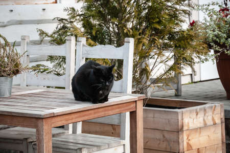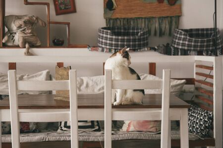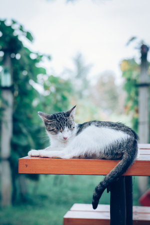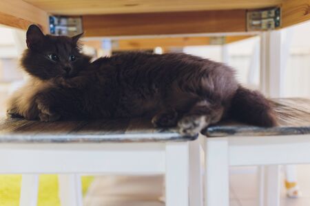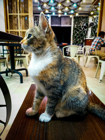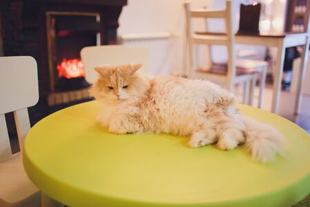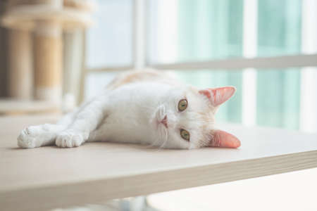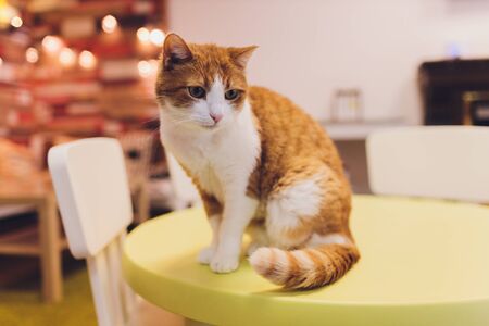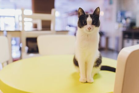 A cute cat on wood table in cat cafe. Cat cafe is a theme cafe whose attraction is cats that can be watched and played with.