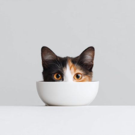 A charming cat with tricolor fur looks curiously over a simple white bowl, creating a playful and warm ambiance perfect for animal lovers and home decor.