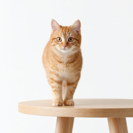 A charming orange kitten captures attention while sitting on a light wooden table. The feline's curious gaze and playful demeanor create a delightful atmosphere, perfect for pet lovers.