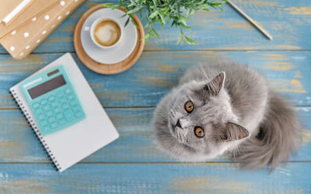 A gray cat of British breed sits on a desktop and looks at the camera. Top view, copy space.