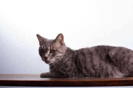 Gray striped shorthaired domestic cat laying on table indoors near white wall of a room