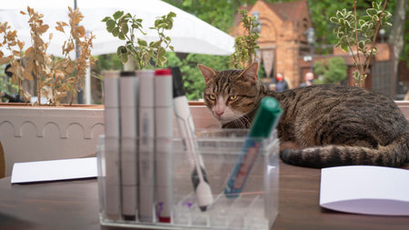 Freelance illustrator workplace in outdoor cafe. The local cat lies on the table. Remote work with pleasure.