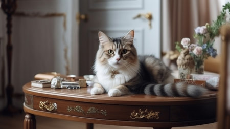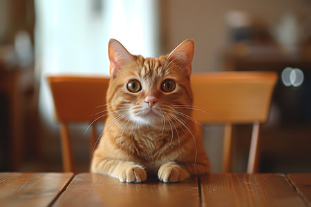 Cat Table Sitting Indoor: A Gray Tabby Cat Sitting on a Wooden Table Inside a Home.