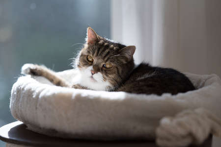 tabby white british shorthair cat relaxing in pet bed on top of scratching pole in the sunlight