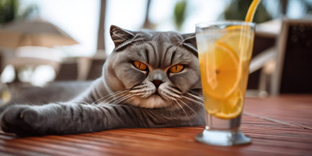 Cat is on summer vacation at seaside resort and relaxing rest on summer beach of Hawaii. distinct generative AI image.