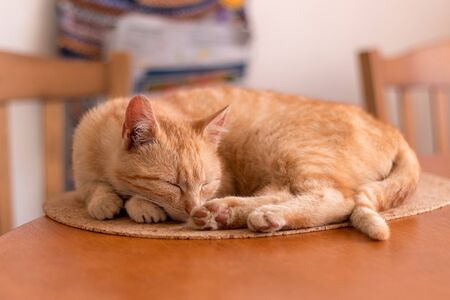 Cute ginger kitten sleeping on table in kitchen, close up view