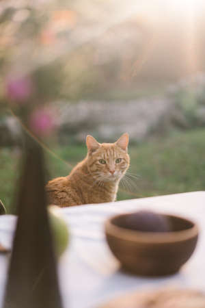 Cute tabby gray cat on a table in a street cafe of Budva old town, Montenegro. Portrait of a street cat.