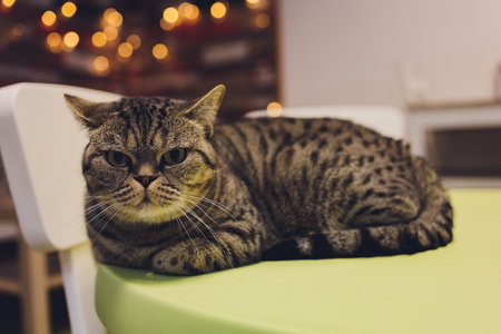 Closeup of cute domestic tabby house cat felis catus relaxing indoor at home sitting on table with tablecloth