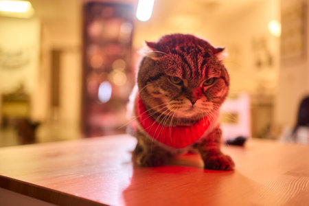 A Cat Wearing a Sweater and Surrounded by Cozy, Warm, and Twinkling Lights