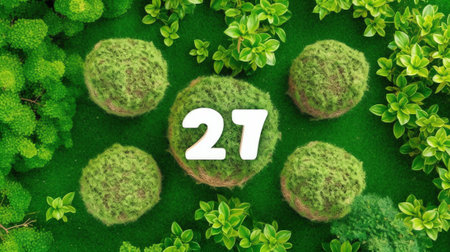 An eye-level aerial shot showcasing a park with a circular design, featuring pink pathways, green foliage, and a central figure.