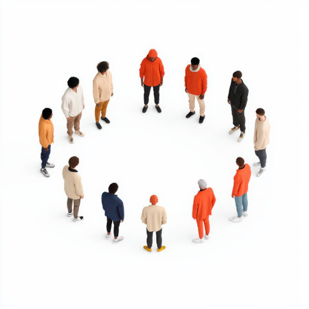 Diverse Group of People Standing in a Circle in Vibrant Clothing on a White Background for Community and Connection Themes