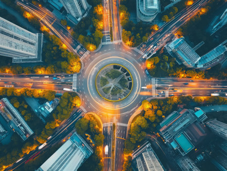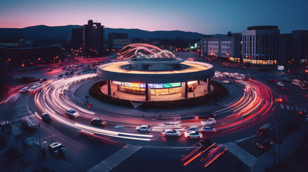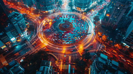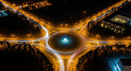 Aerial view of a bustling circular intersection at night, showcasing vibrant light trails from moving vehicles. The modern design highlights urban traffic patterns and infrastructure.