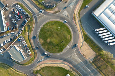 Aerial view of road roundabout intersection with moving heavy traffic. Urban circular transportation crossroads