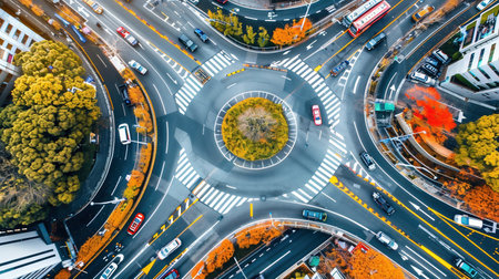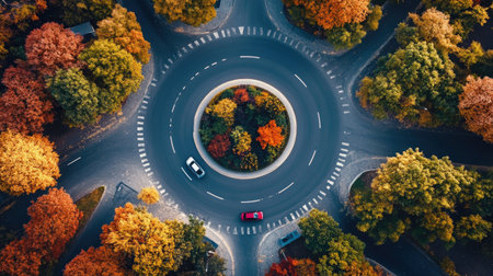This stunning aerial view captures a roundabout embraced by vibrant autumn foliage, creating an engaging contrast with urban structures. The scene combines nature and city life seamlessly.