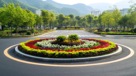 A vibrant roundabout adorned with colorful flowers and lush greenery, set against a picturesque mountainous backdrop, creating a serene urban landscape.
