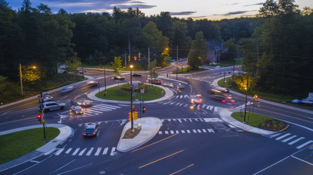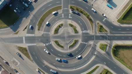An aerial top-down perspective captures the seamless flow of traffic through a modern, circular roundabout.