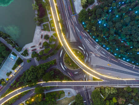 An aerial view captures the mesmerizing swirl of car lights, creating a dynamic urban vortex on the citys roads at twilight.