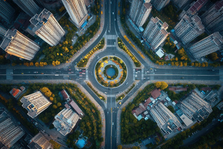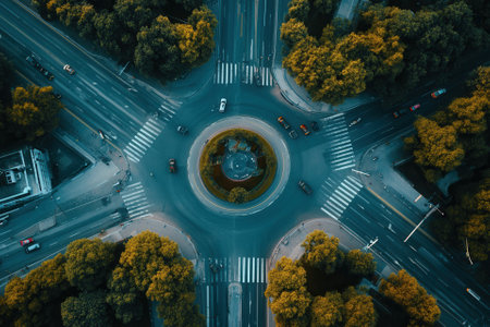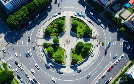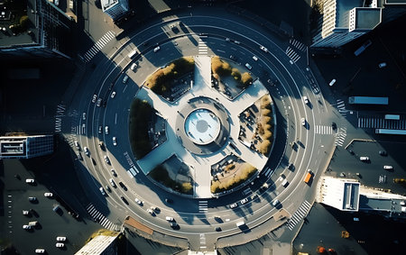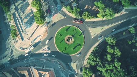 top view of a roundabout in the middle of a busy city. aerial view centered symmetrical.