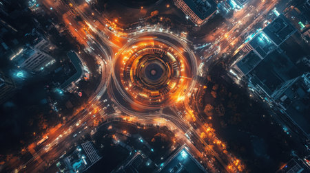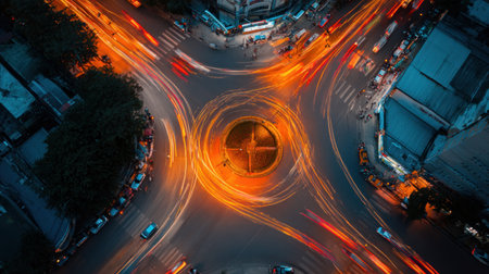 An overhead view captures a bustling roundabout at night, showcasing light trails from moving vehicles. The composition features radial symmetry with streaks of orange and white lights. Buildings surround the central island. Suitable for illustrating urban transportation, city planning, or background visuals.