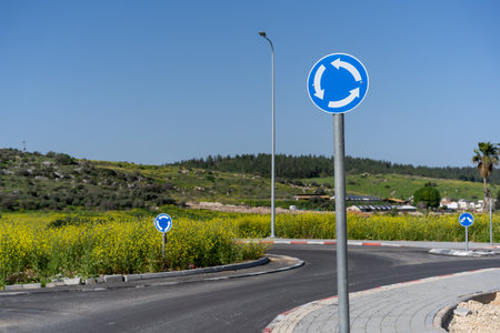 A solitary roundabout traffic sign against a backdrop of a vibrant yellow field and clear skies. Traffic sign with a circular arrow pointing the way for roundabout navigation.
