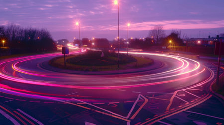 Soft hues of pink and purple light trails add a dreamy touch to the movement of cars at a roundabout