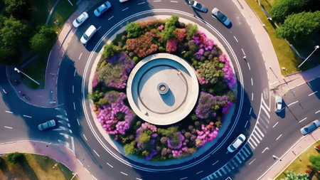 Capture the essence of urban greenery with this aerial view of a circular garden in a bustling roundabout, showcasing vibrant flower beds and lush plants.