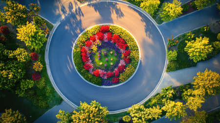 This stunning aerial photograph captures a roundabout adorned with colorful flower beds and lush greenery, creating a peaceful oasis in a neighborhood setting.