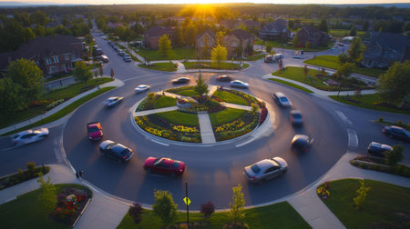 An aerial view captures a vibrant roundabout surrounded by lush landscaping in a peaceful suburban area, highlighting the morning's soft sunlight.