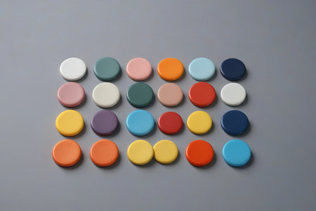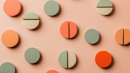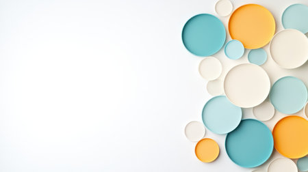 This image features an artistic arrangement of colorful circular shapes on a soft surface. The playful design emphasizes contemporary aesthetics and vibrant tones, perfect for various creative projects. Ideal for backgrounds and decorative purposes.