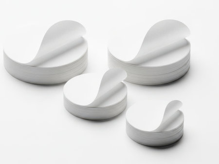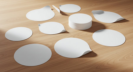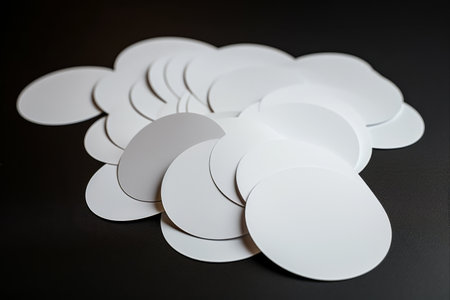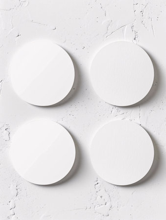 White, round coasters lay scattered on a white surface