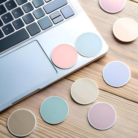 Pastel colored circle stickers on a wooden desk next to a laptop. Perfect for adding a touch of color and whimsy to your designs.