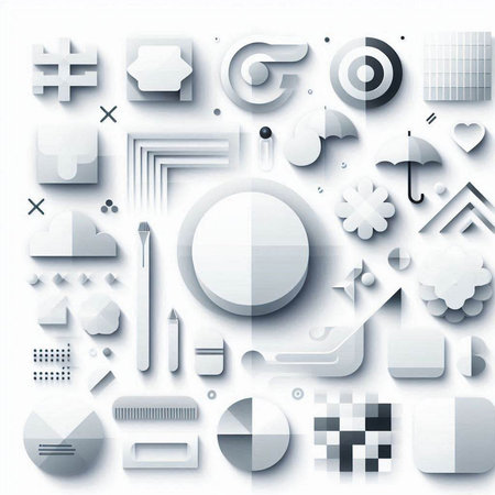 A collection of geometric shapes in neutral colors and various textures arranged on a light surface.