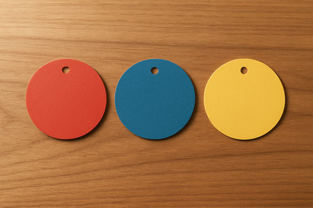 Red, Blue, and Yellow Circular Tag Mockup on Wooden Table – Premium Presentation