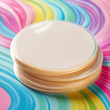 Isolated showing stack of blank round coasters on a swirling rainbow background keywords: stack, round, coasters, blank, white, beige, circular, objects, surface, design, copy space, rainbow,...