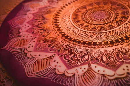 Embossed mandala in warm shades of pink and orange with intricate floral details