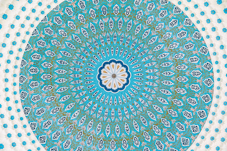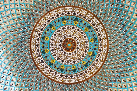 white round dome of rotunda decorated mosaics with a traditional oriental Arabic uzbek pattern blue ornament in Uzbekistan