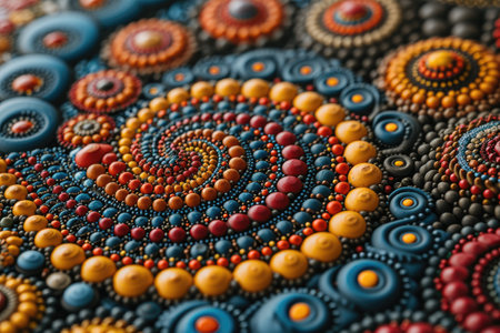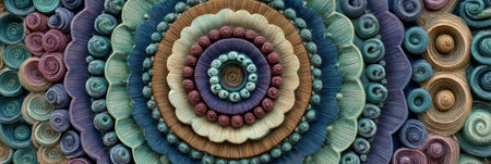 A decorative art piece displays vibrant circular and spiral patterns made from layered materials, captivating viewers with its intricate designs.