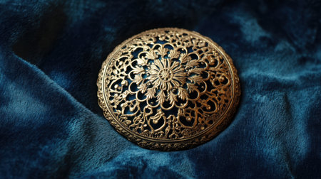 This image showcases an ornate metal ornament featuring a detailed floral design, elegantly placed on a soft blue fabric, highlighting its intricate craftsmanship.